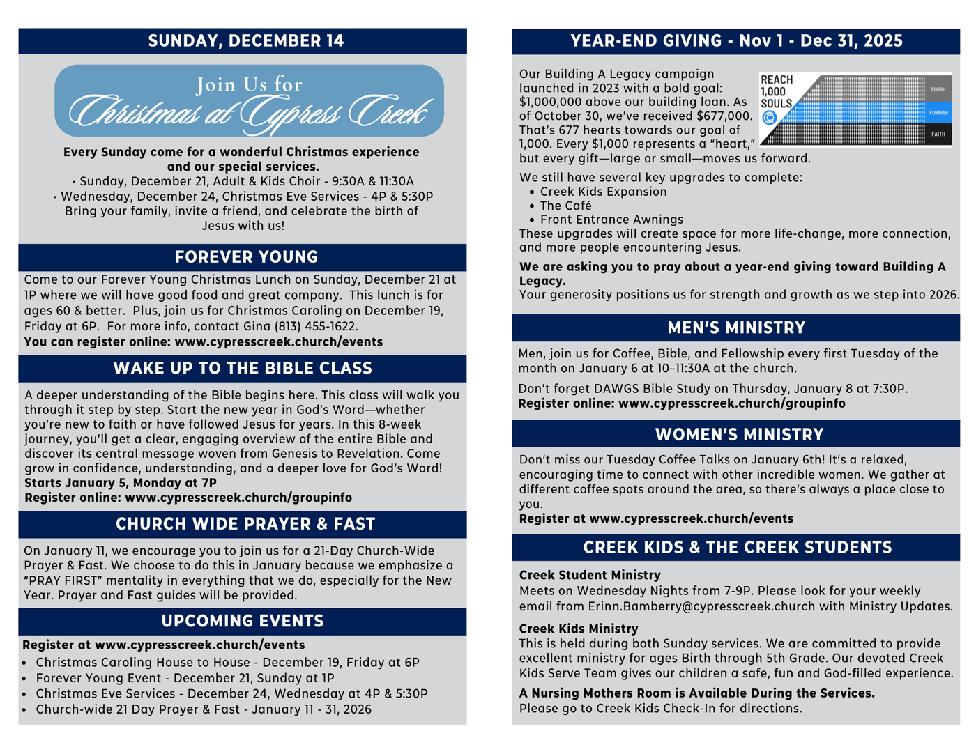 ● Let’s make Heaven crowded. Grab our Christmas Invite Cards located in the Lobby to use as a tool and invite your friends and family to church with you, especially our Christmas Eve Services on December 24 at 4P and 5:30P.